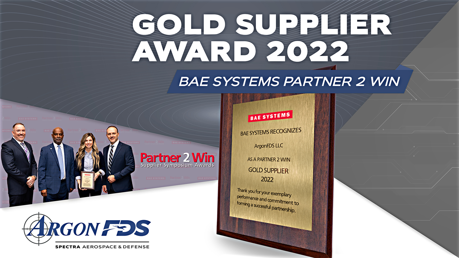 Today, ArgonFDS announced that it has won the Gold Supplier Award at the 2023 BAE Systems Partner 2 Win Symposium in Austin, TX. The award is a recognition of Argon’ commitment to providing high-quality rugged computing, displays, and exceptional customer service to the aerospace & defense industry.