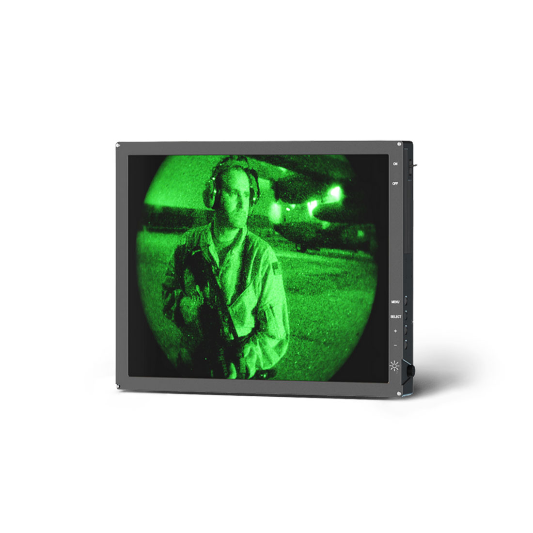 The ARD17 is a 17″ ruggedized TFT LCD display built for command and control console applications in combat vehicles, mobile shelters and close-in naval spaces. A small bezel, IP66-sealed aluminum enclosure and universal AC/DC power input fit tight operational consoles. Optional NVG compatibility, 750-nit high brightness and analog-resistive or PCAP touch adapt the display to mission-specific workflows.